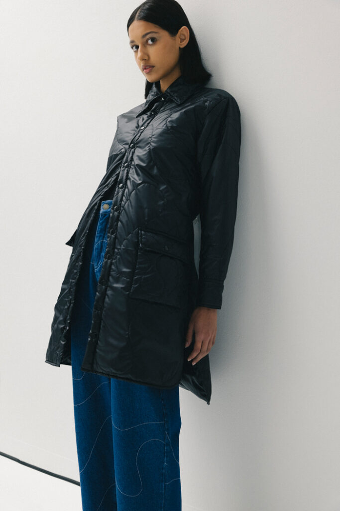 Oversize patchwork coat with side pockets.